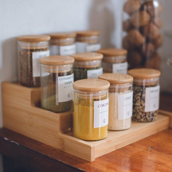 Perfecta para mantener los especieros a la vista y sumar un toque natural a la cocina.