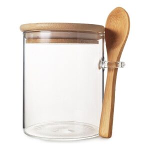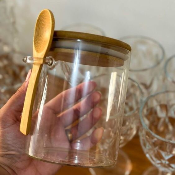 Frasco de vidrio con cuchara y tapa de bambú – Práctico y funcional para la cocina