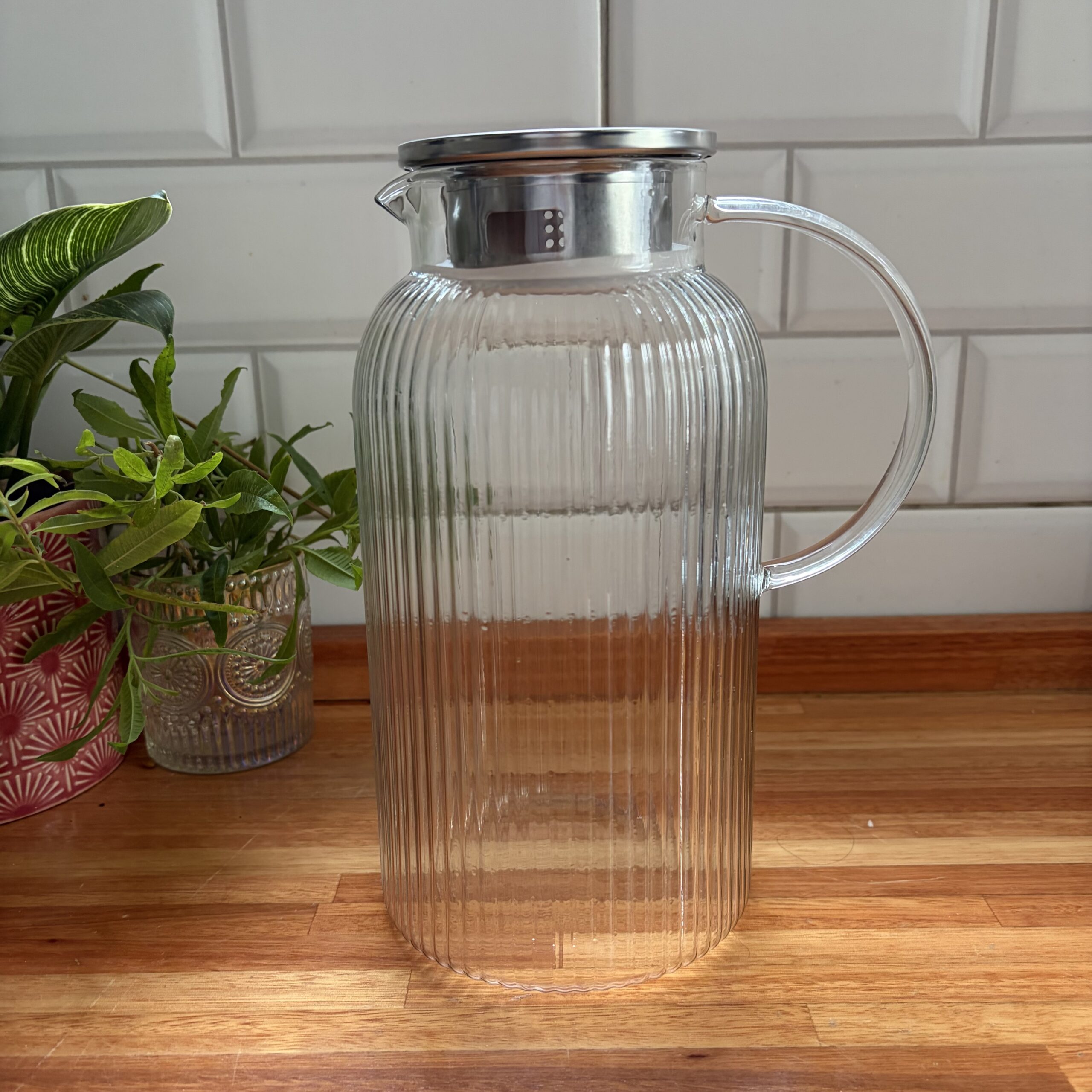 La jarra Mahia es una pieza práctica y elegante, ideal para servir bebidas en el día a día 🍹. Su diseño en vidrio con acabado rayado aporta textura y un estilo moderno, sumando un toque distintivo a tu mesa 🍽️.