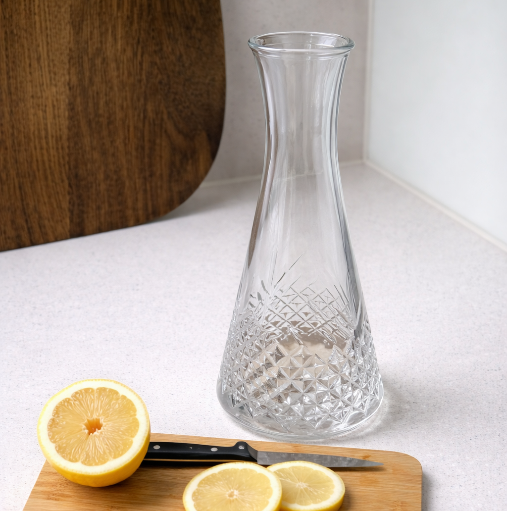 Su formato alargado la hace ideal para servir agua, jugos o limonadas, combinando funcionalidad con un estilo simple y moderno.