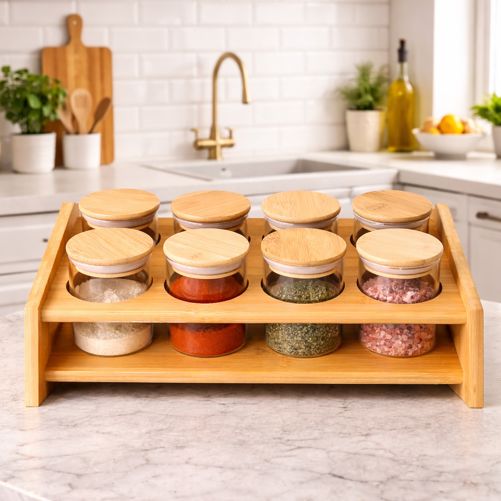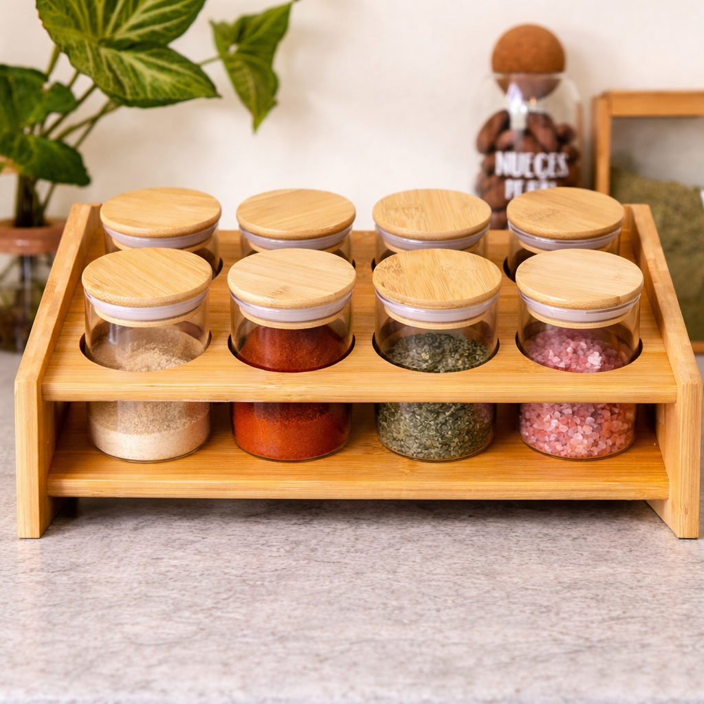 El juego de 8 especieros con base es una solución práctica y decorativa para mantener las especias organizadas y siempre al alcance. Incluye un soporte de bambú que aporta un estilo natural y elegante a la cocina.
